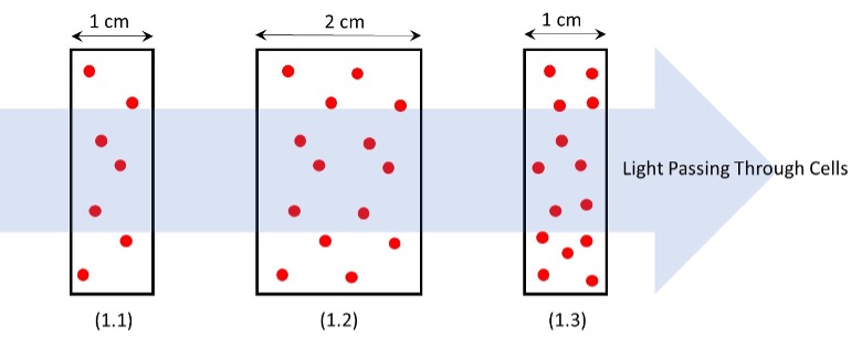 Figure 1: Light passing through spectrophotometric cells of various thicknesses (b) and having different concentrations of H2O2 (C). (1.1) 1 cm cell with 7 H2O2 molecules: A = 7 molecules/cm. (1.2) 2 cm cell with 14 H2O2 molecules: A = 7 molecules/cm. (1.3) 1 cm cell with 14 H2O2 molecules: A = 14 molecules/cm.